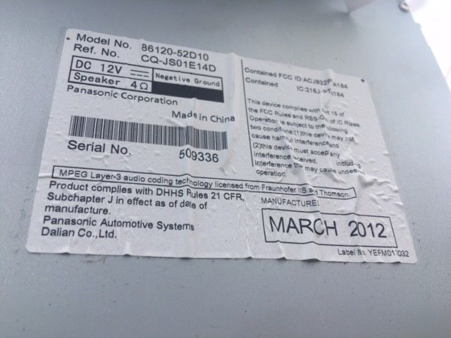 2012-2014 TOYOTA PRIUS C AM/FM Radio MP3 Single CD Player 86120-52D10